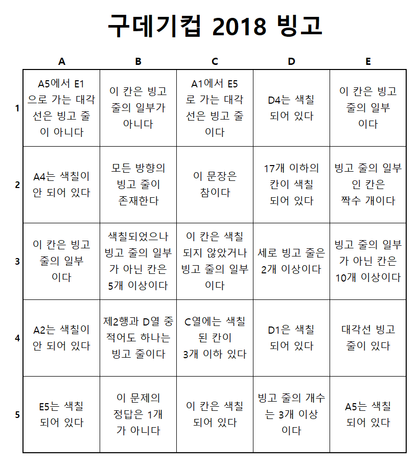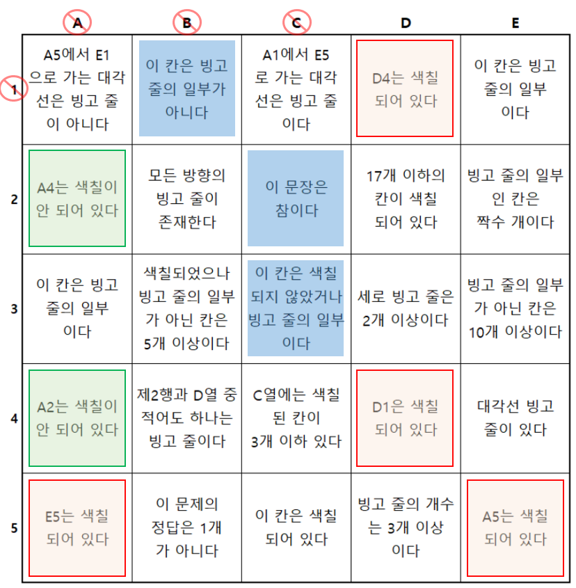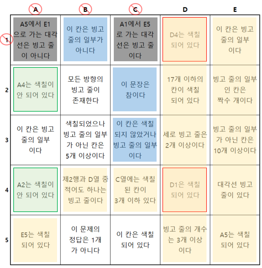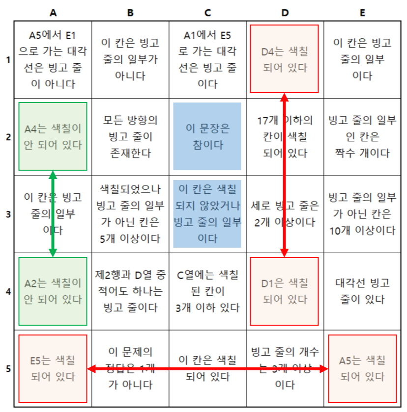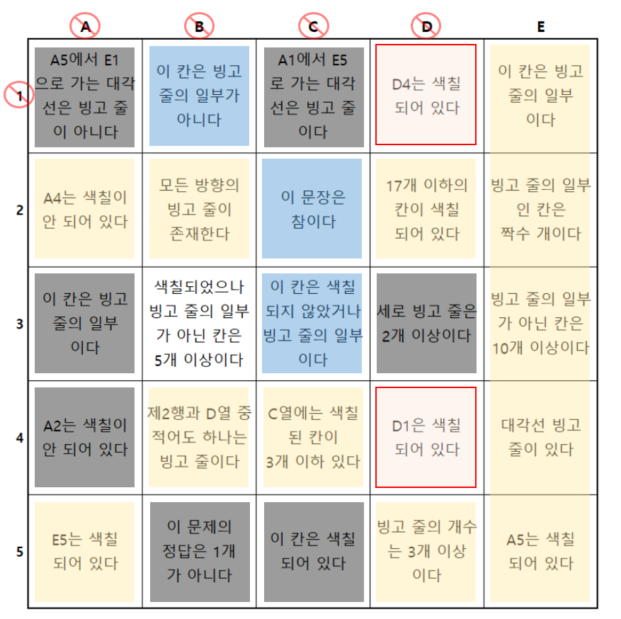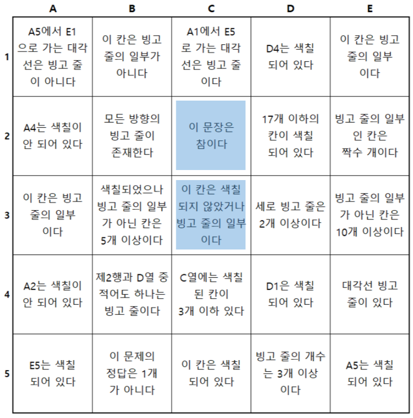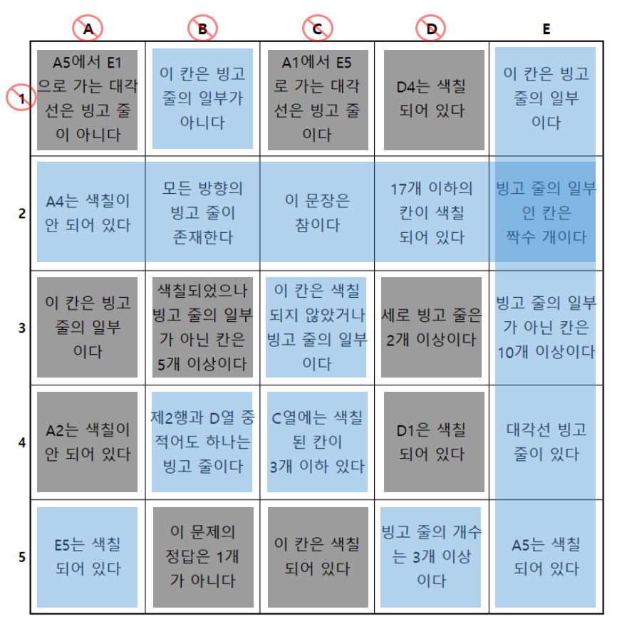 상황가정 : E가 세로 빙고줄 일 때 E5에 의해서 A5 색칠됨. 세로 빙고줄이 한 줄 이니까 D3만족 x, 따라서 A3도 만족 x E4에 의해서 빙고줄 하나 존재. ↘일지↗일지 지금부터 판별해보자. 만약 ↘라면 C1과 C3가 참이 된다. 그러면 1행이 빙고 줄이 되면서 B1이 모순이 되므로 안된다. 따라서 빙고 줄은 ↗이다. 그러면 B4가 참이 되는데, D열은 빙고 줄이 될 수 없으므로 2행이 빙고 줄이 되야한다. 그러면 A2가 칠해지고, A4는 거짓이 된다. 대각선, 2행, E열 이렇게 3줄의 빙고가 생겼으므로 D5도 참이다. C4도 참이되고, C5는 거짓이 된다. 이 상황에서 E2랑 E3도 만족한다. B3는 만족하지 않는다. 이제 남은 칸은 B5인데,, 확실하진 않지만 이정도로 빙고에 대한 자세한 설명이 있다면 정답이 하나만 있을 것이라는 추측이 들어 거짓으로 표시했다.