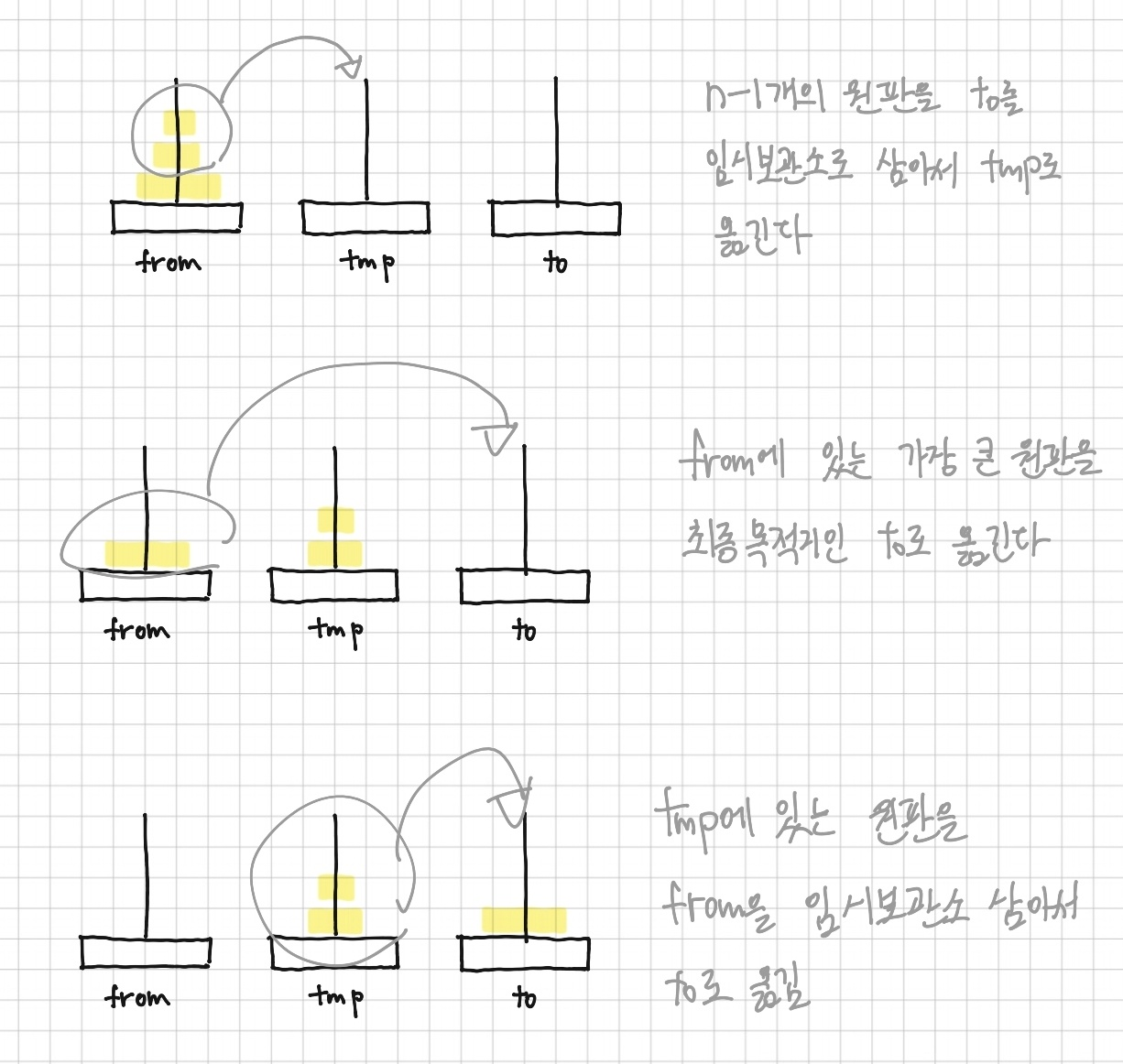 //막대 from에 쌓여있는 n개의 원판을 막대 tmp를 사용해 to로 옮긴다.